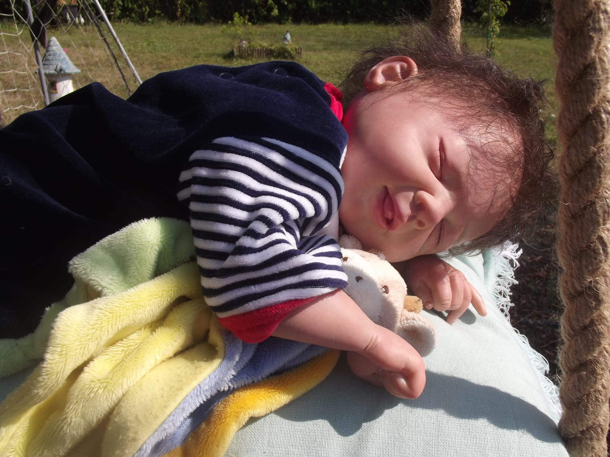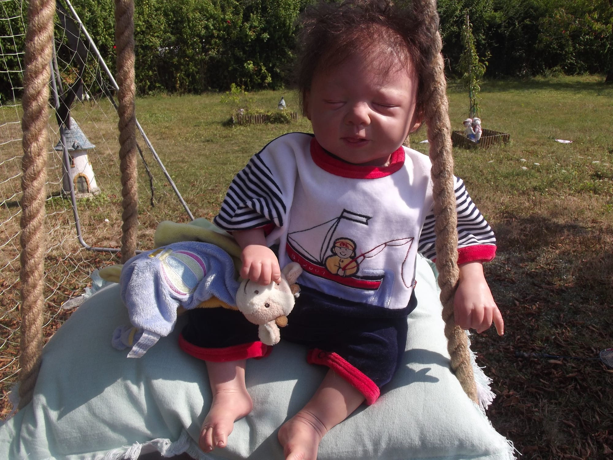 Je vous présente mon petit Malo qui bavouille en rêvant sur sa balançoire, issu du kit Robin de Pat secrist .