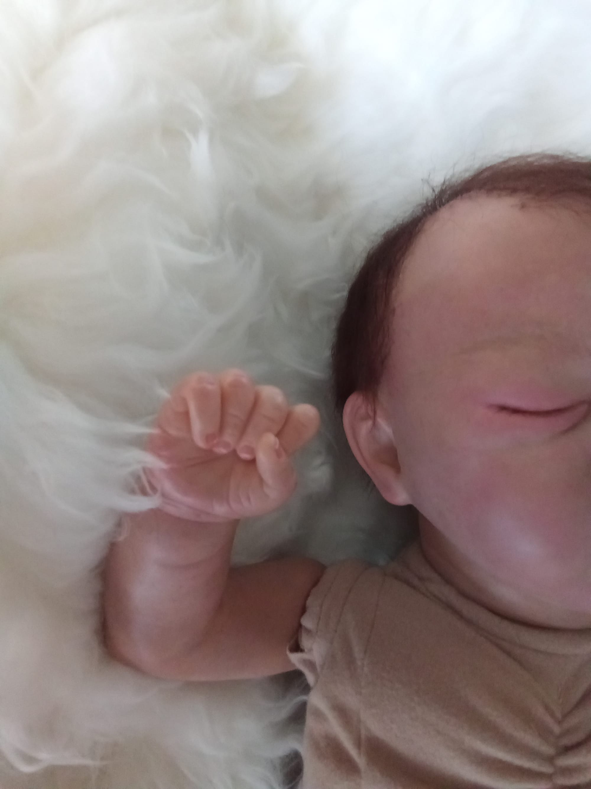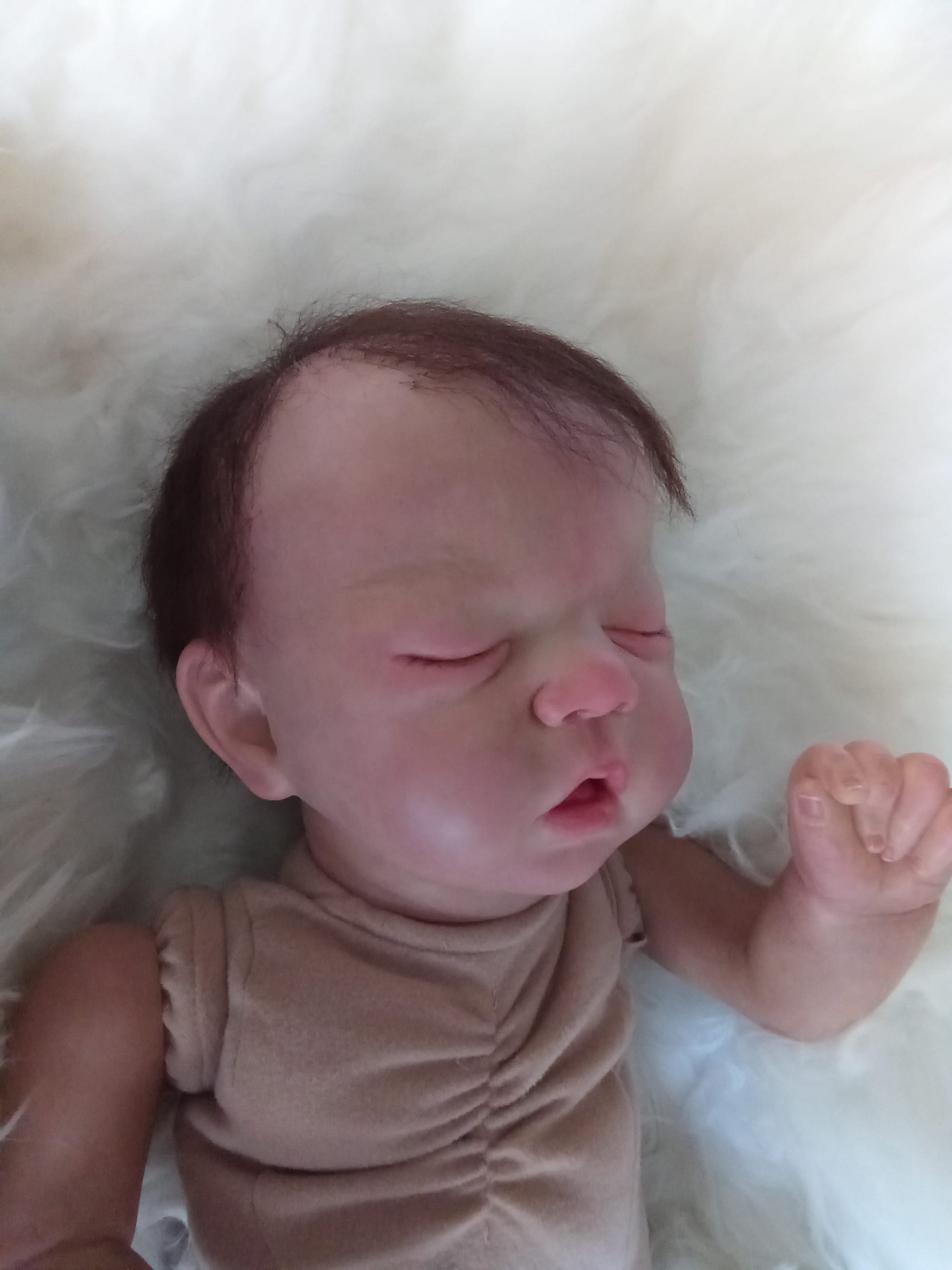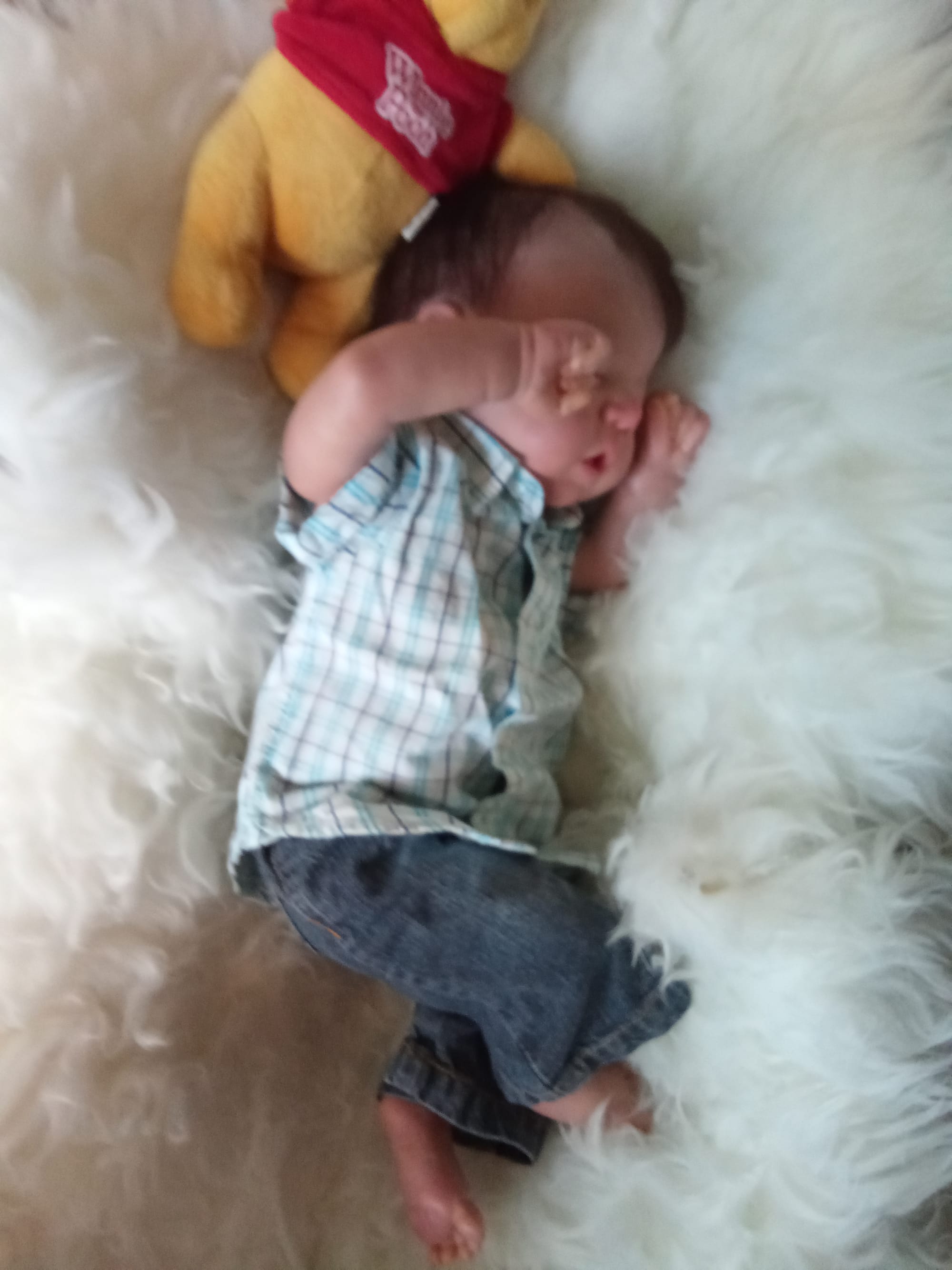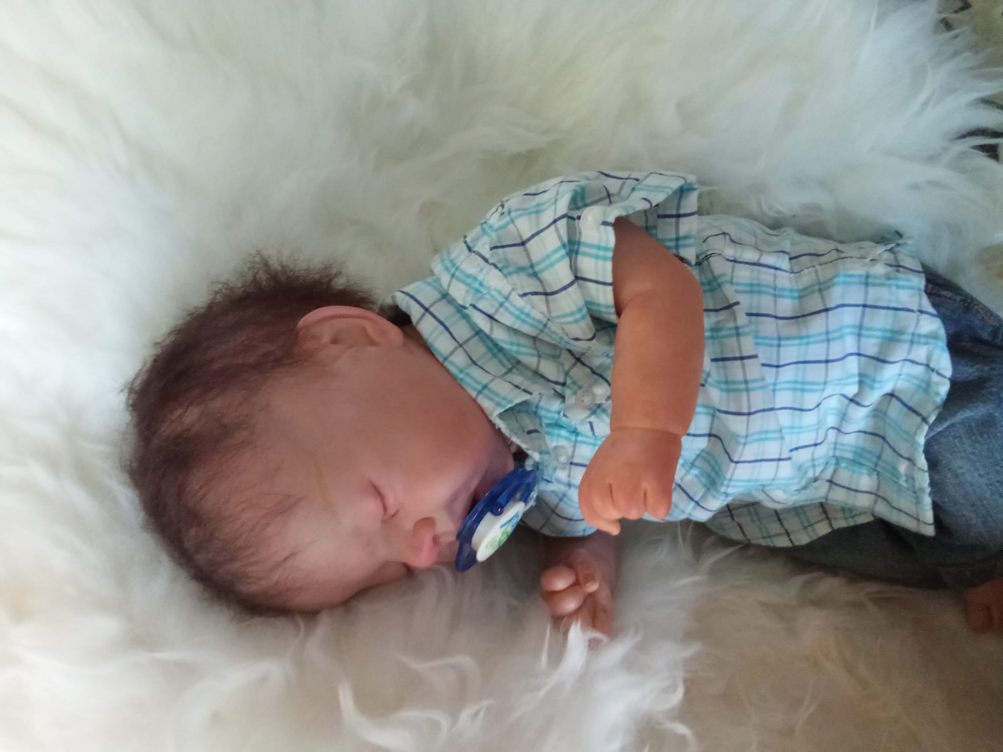 Je vous présente Raphaël du kit Charlee de Sandy Faber, gravure sur la nuque. Il mesure 50 CMS et pèse 1kg 560. Le rooting est fait avec des aiguilles de 46 et du mohair Susan Nagel, peinture acrylique, granulat de chez puppen traumland pour les membres,billes de verre de chez puppen traumland pour le corps et la tête et bourre hyppoallergenique .Certificat d'authenticité fourni. Il viendra chez vous avec sa tenue, son doudou et des petites surprises.